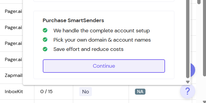 If you don’t want to choose Pre-Warmed Mailboxes, (Pre-Warmed Mailboxes are already verified, deliverability-tested, and ready to send campaigns instantly), hover over Purchase SmartSenders and click Continue.