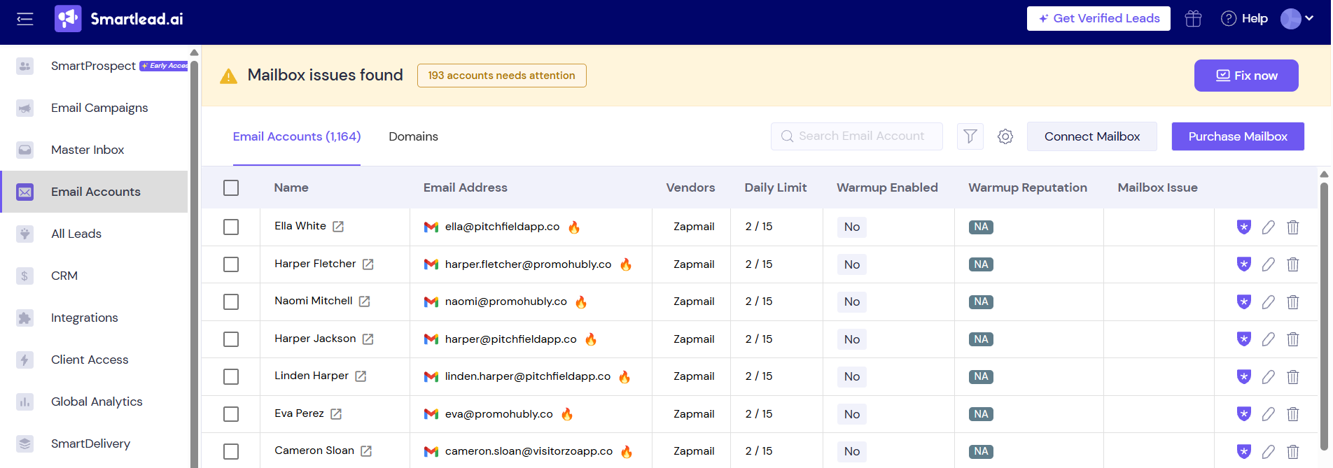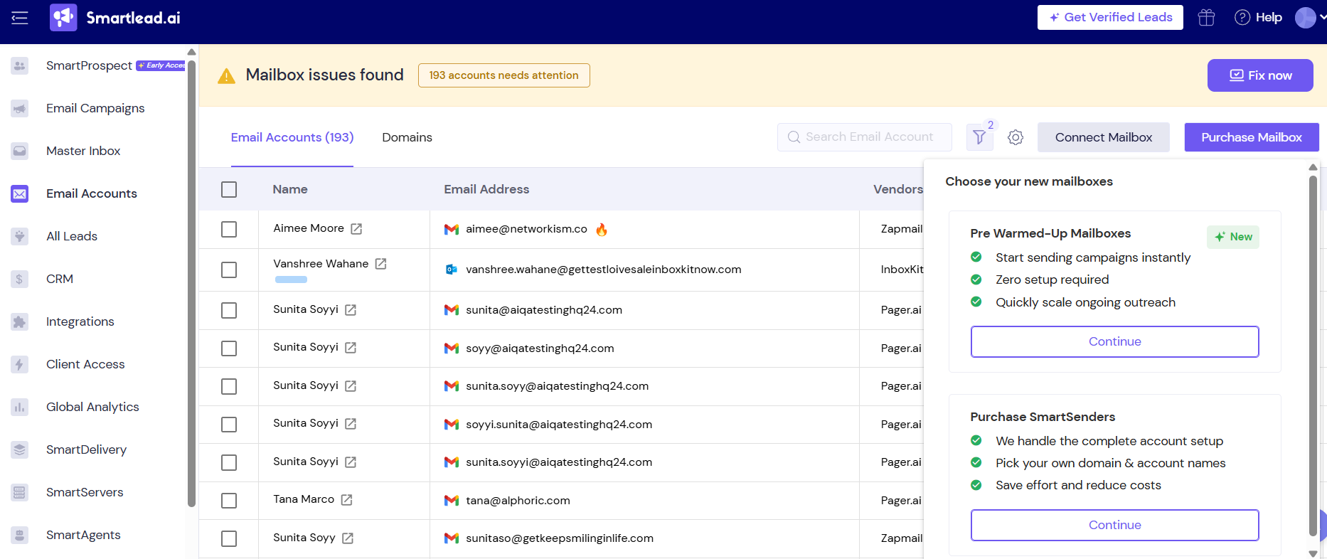 You can’t add new email accounts for existing domains, however, you can purchase additional domains and add mailboxes any time through the Email Accounts section on your Smartlead dashboard.