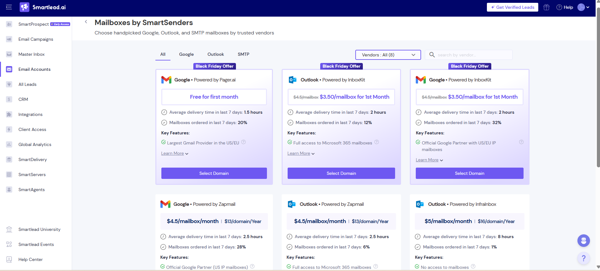 To buy domains and ready-to-use mailboxes from SMTP vendors, Follow these steps to purchase email accounts and domains: