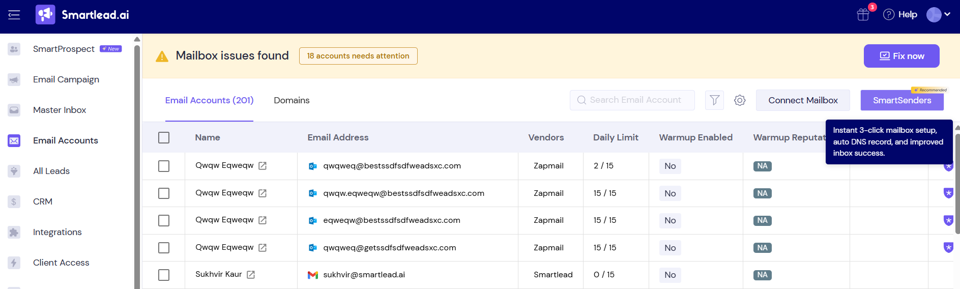 Go to Email Accounts on your dashboard and click Smartsenders to in the top-right corner, to create your primary inbox optimised infra.