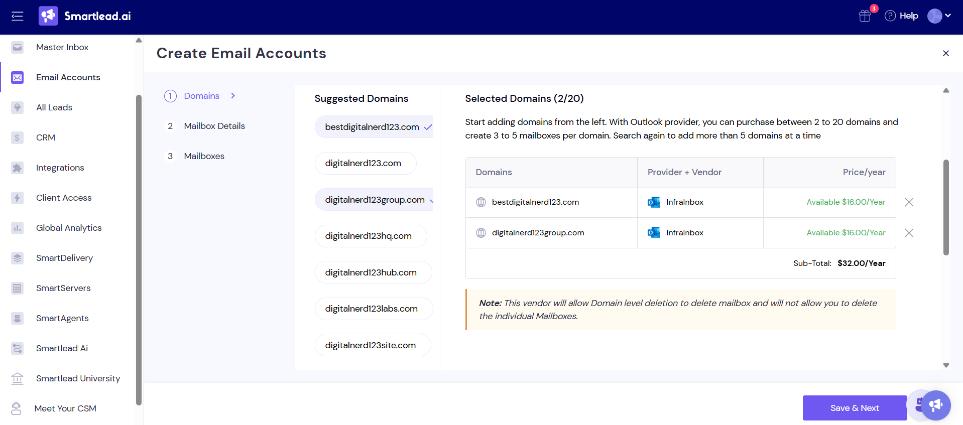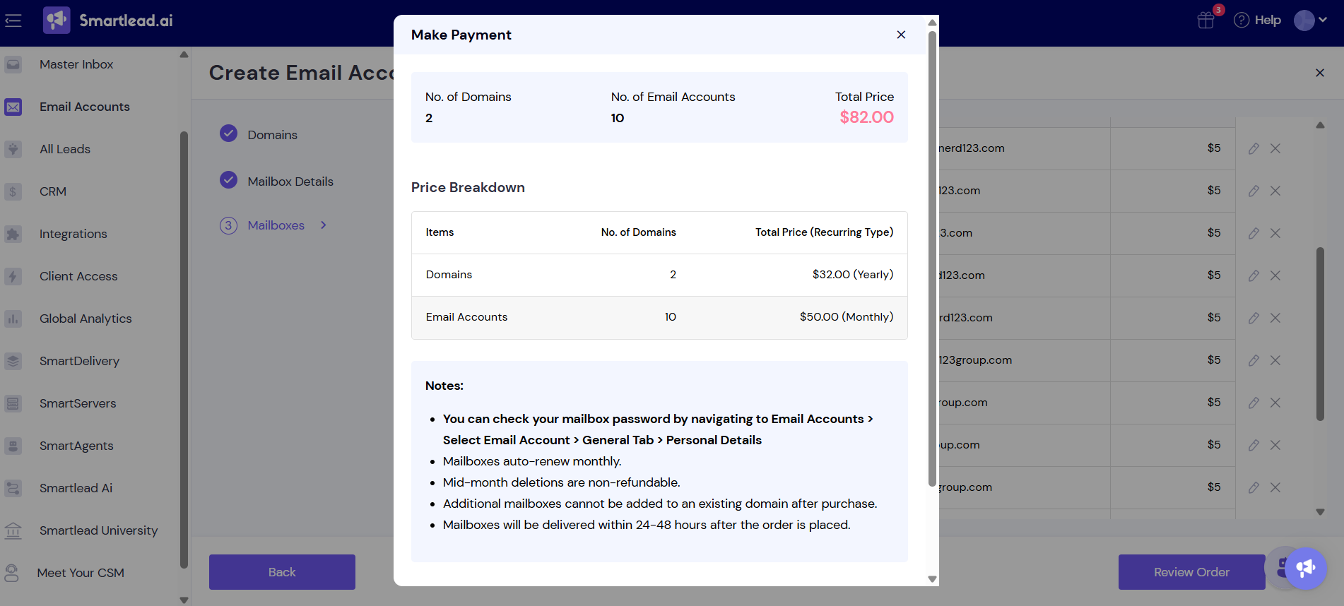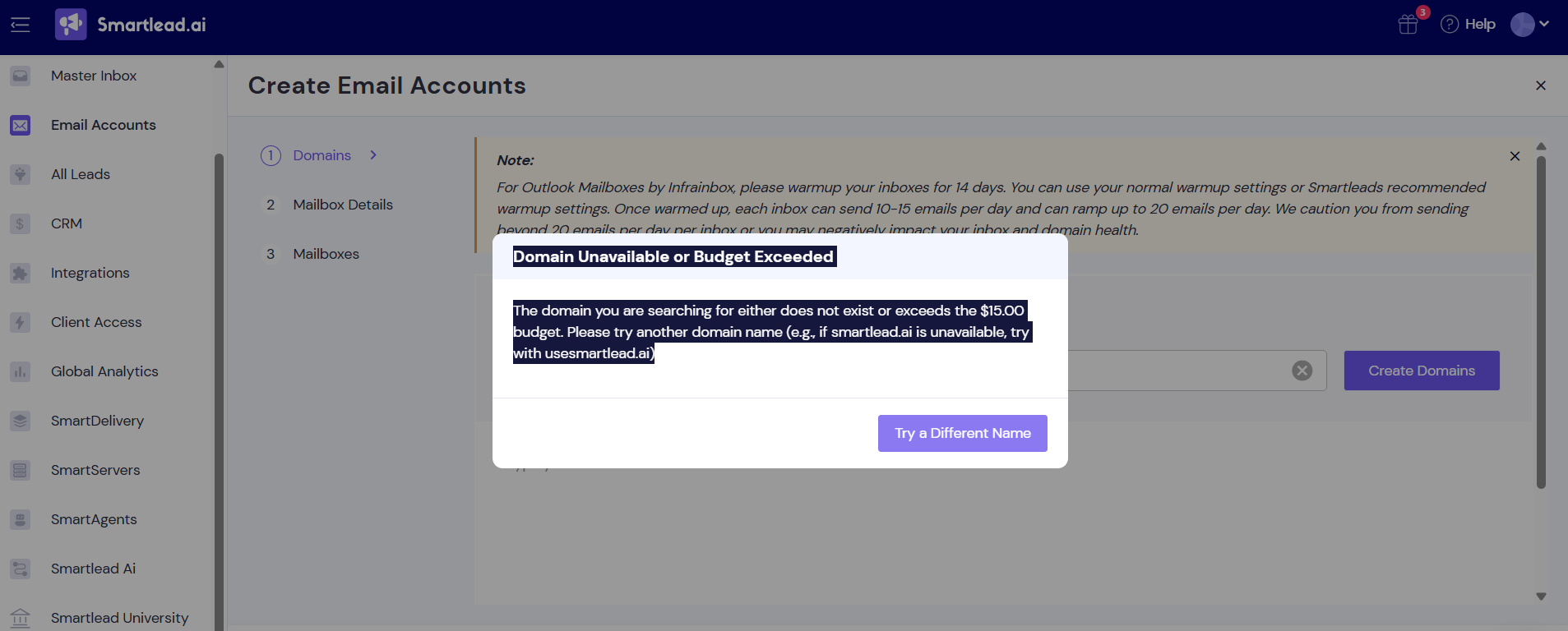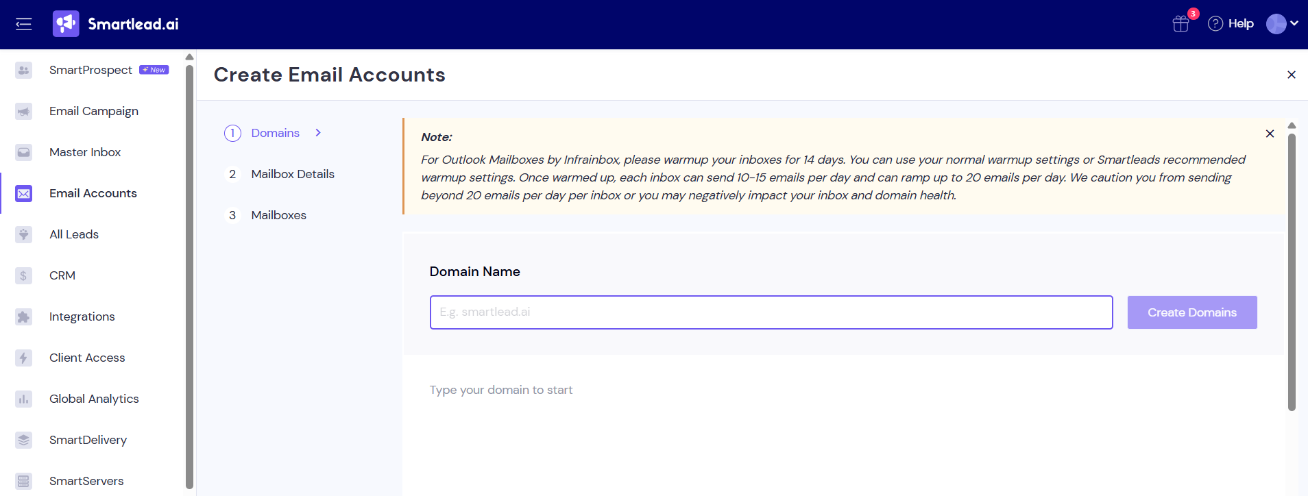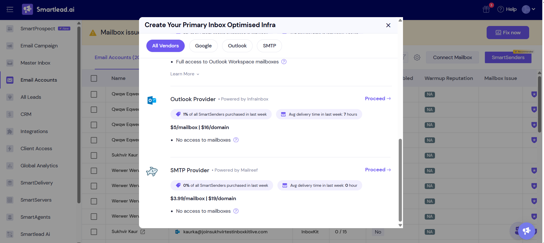 Follow these steps to buy Infrainbox Outlook mailboxes and domains from within your Smartlead account: