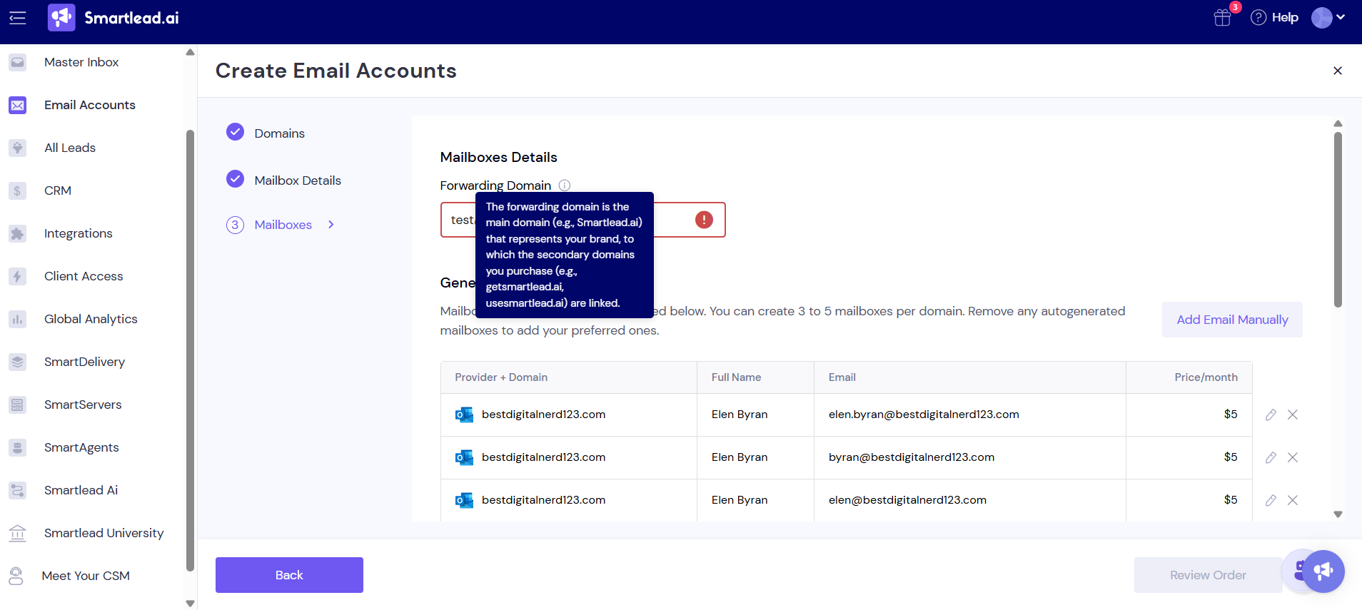 Select your forwarding domain, click Review Order