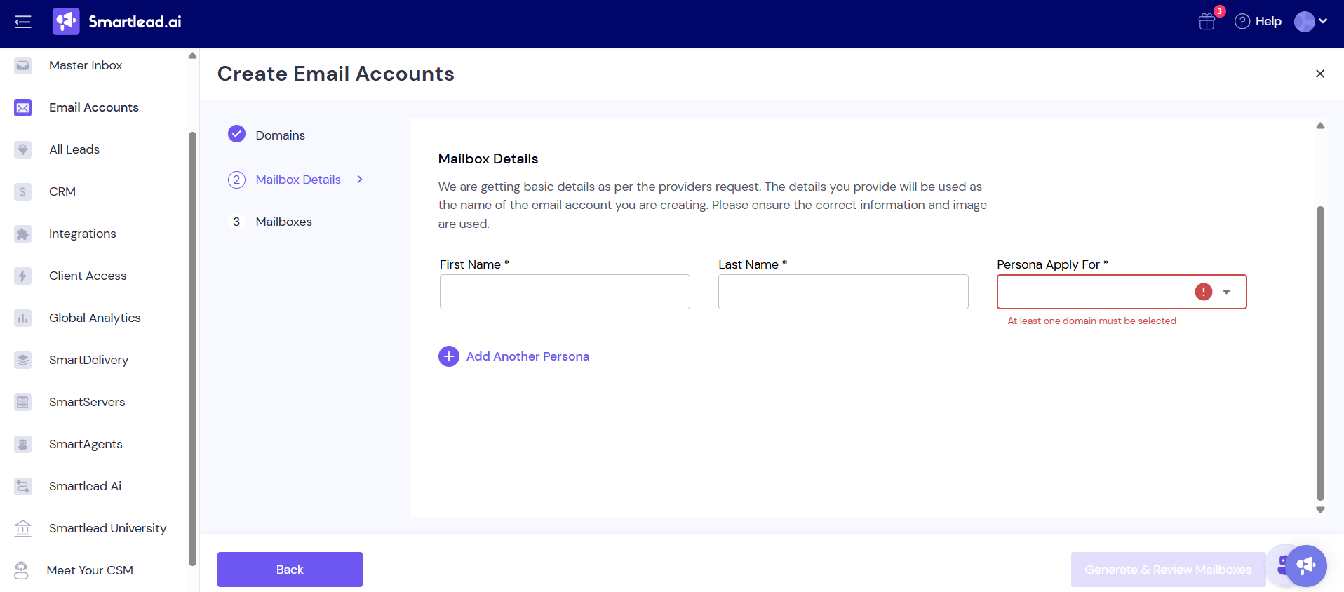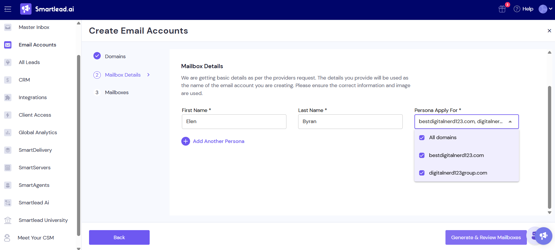 Under Create Email Accounts, add sender personas (first name, last name, profile picture). The system auto-generates mailboxes which you can customize before purchase.