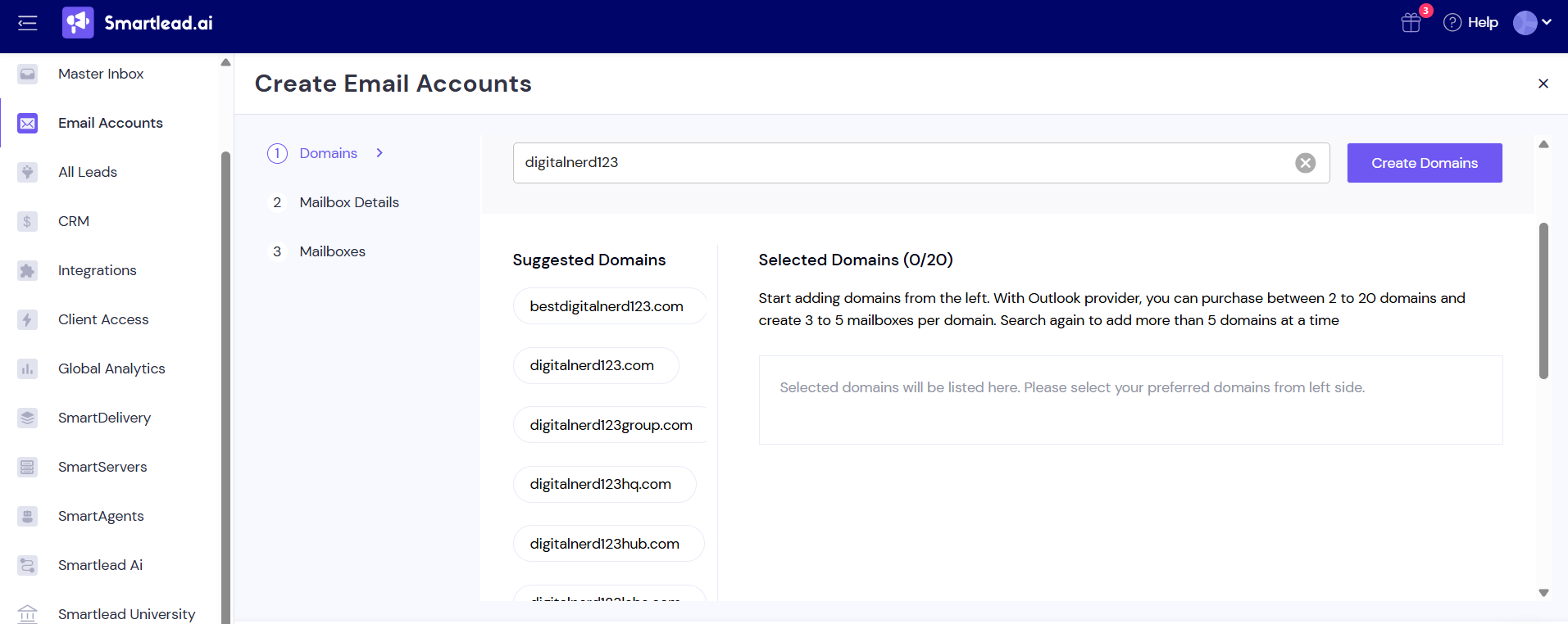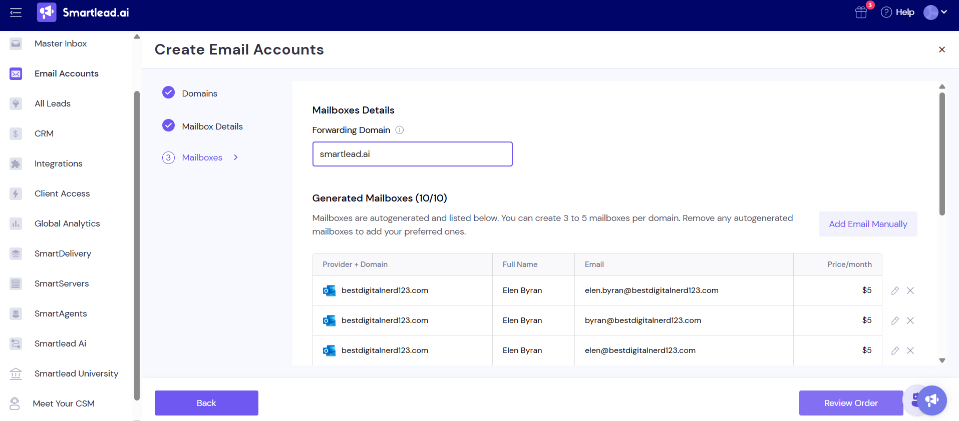 Users can purchase a minimum of 2 domains, up to 20 domains. You can create 3-5 mailboxes per domain. You can auto generate 5 inboxes per domain.