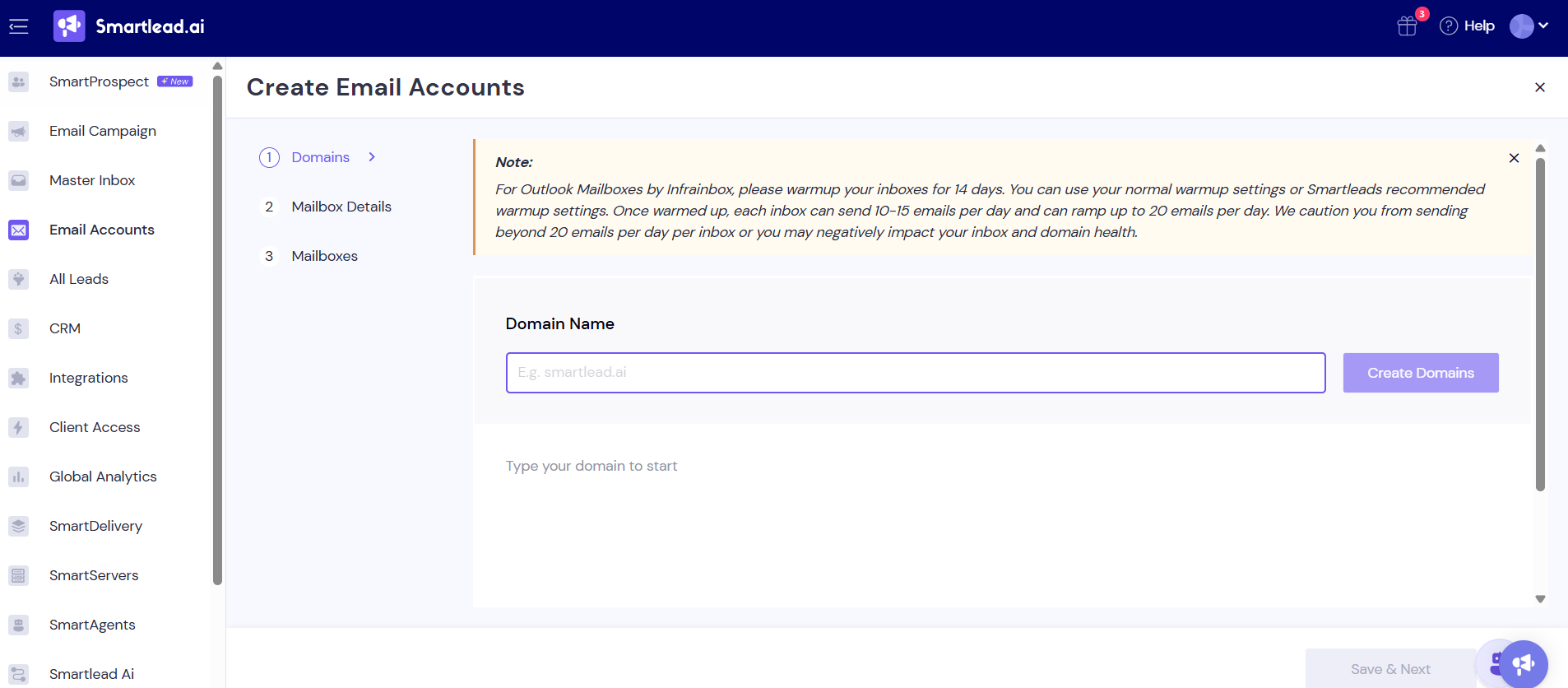 For Outlook Mailboxes by Infrainbox, please warm up your inboxes for 14 days using your regular warm-up settings or Smartlead’s recommended settings.