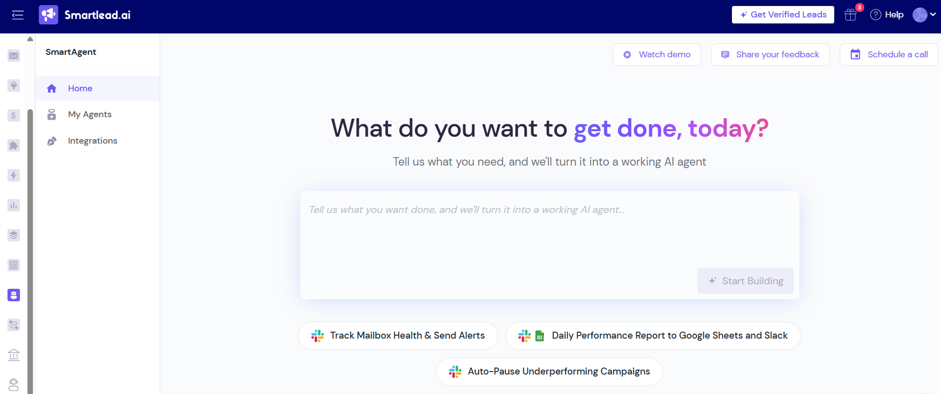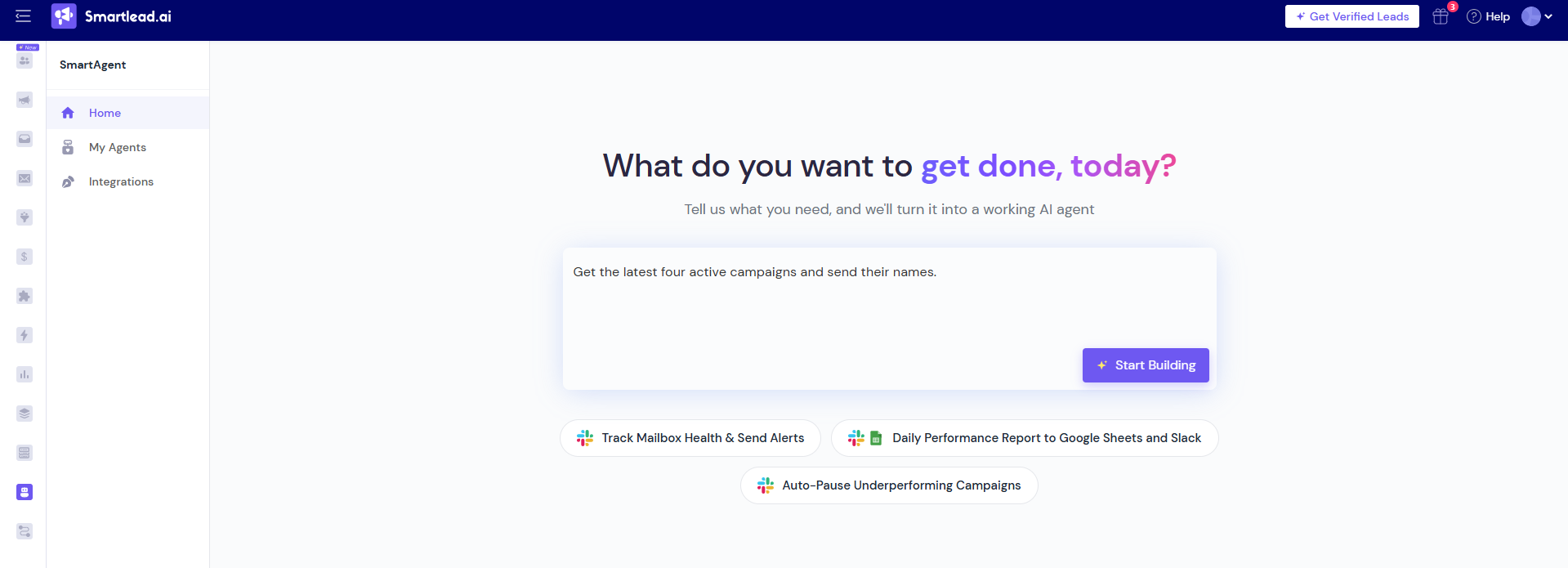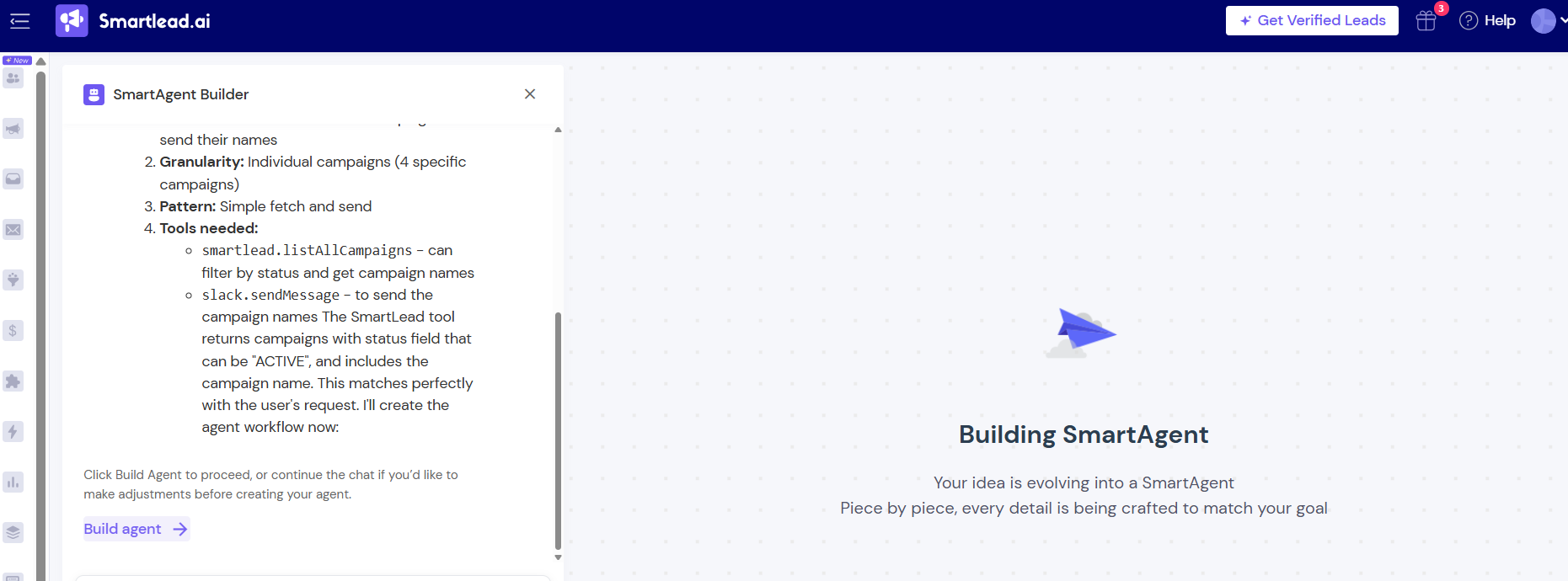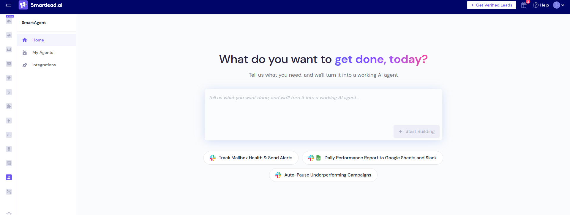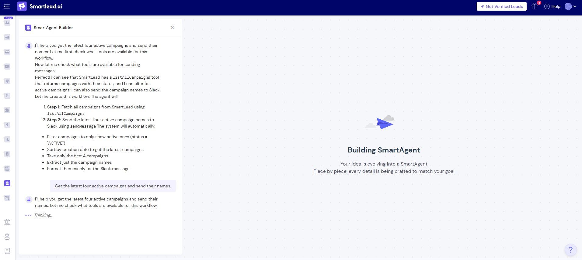 SmartAgents are AI-powered assistants inside Smartlead that help automate your GTM (Go-To-Market) processes. They perform repetitive tasks like collecting campaign data, sending Slack reports, and syncing with external tools, all without manual effort. You simply describe what you want in plain English, and SmartAgents build and run the workflow for you.