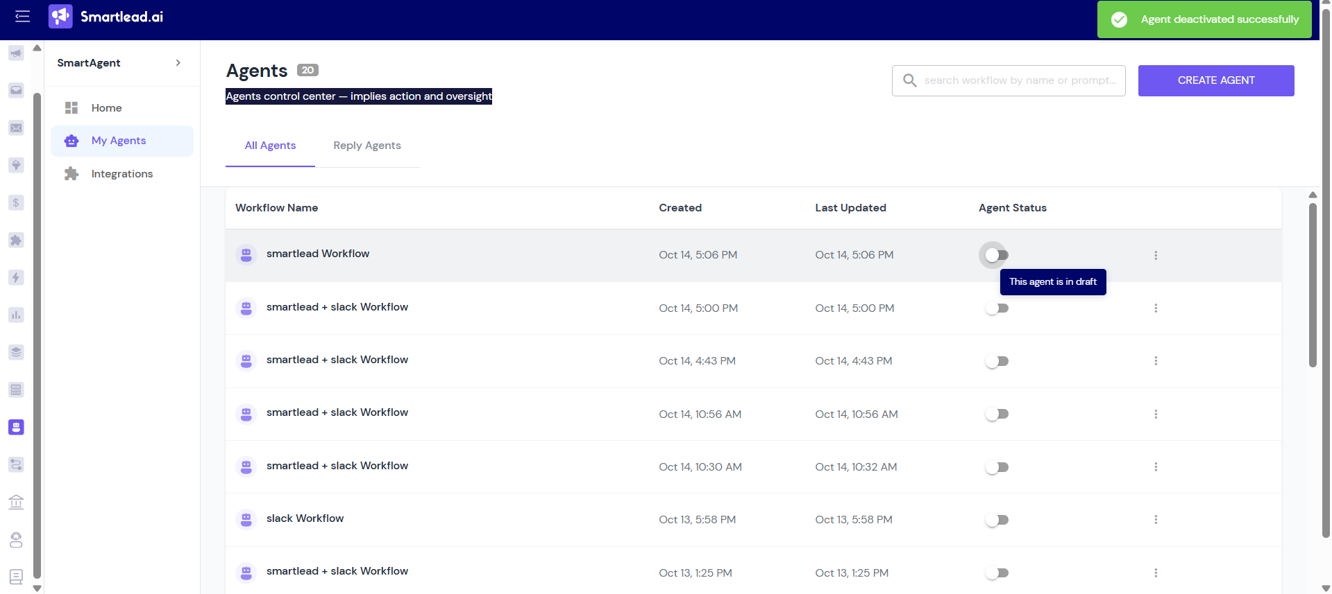 Once deployed, you will be redirected “My Agents List page. You will see all of the agents inside it and also you have an ability to disable and enable it anytime.
