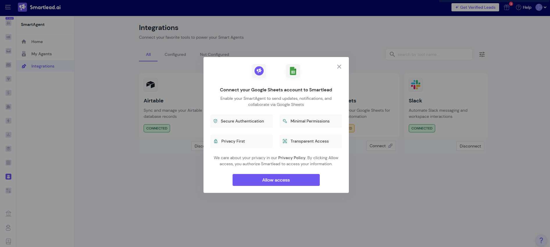 To connect Slack or other tools like Google Sheets, Airtable, or Google Drive to SmartAgents: