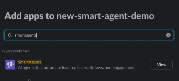 If the Slack app is not added to the channel, you can add it by typing /apps or /writeapps in Slack, then searching for the SmartAgents app and clicking Add.