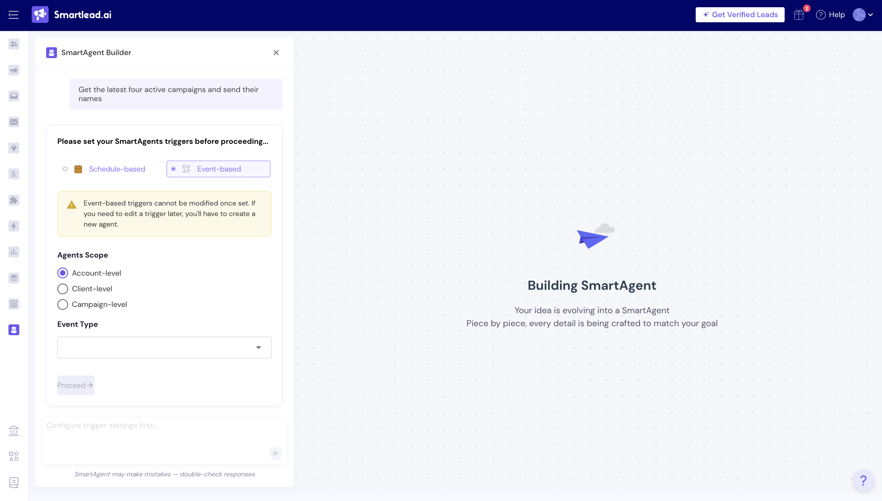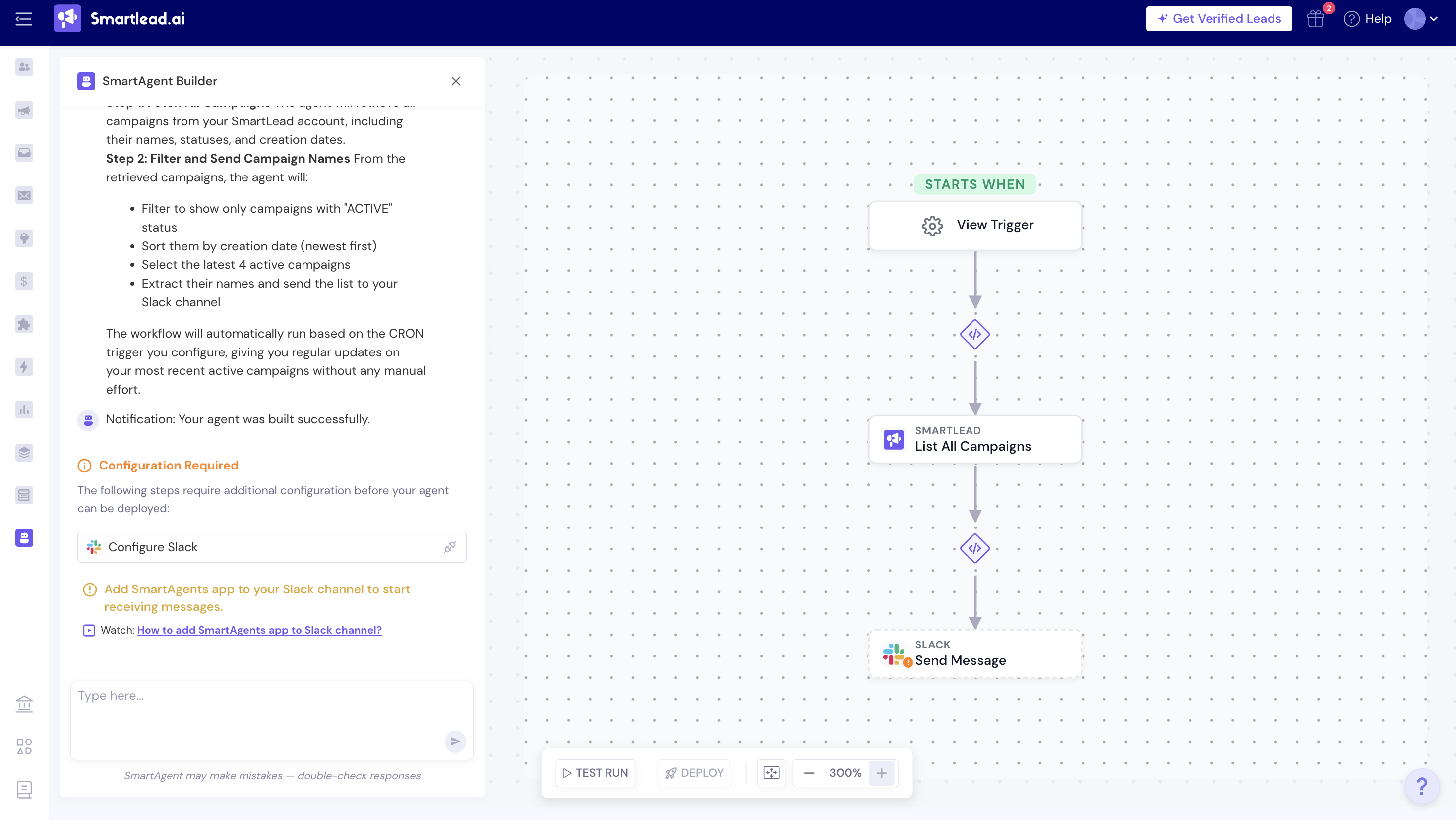 Once you click Build Agent, Smartlead generates the complete SmartAgent workflow based on your prompt and trigger configuration.