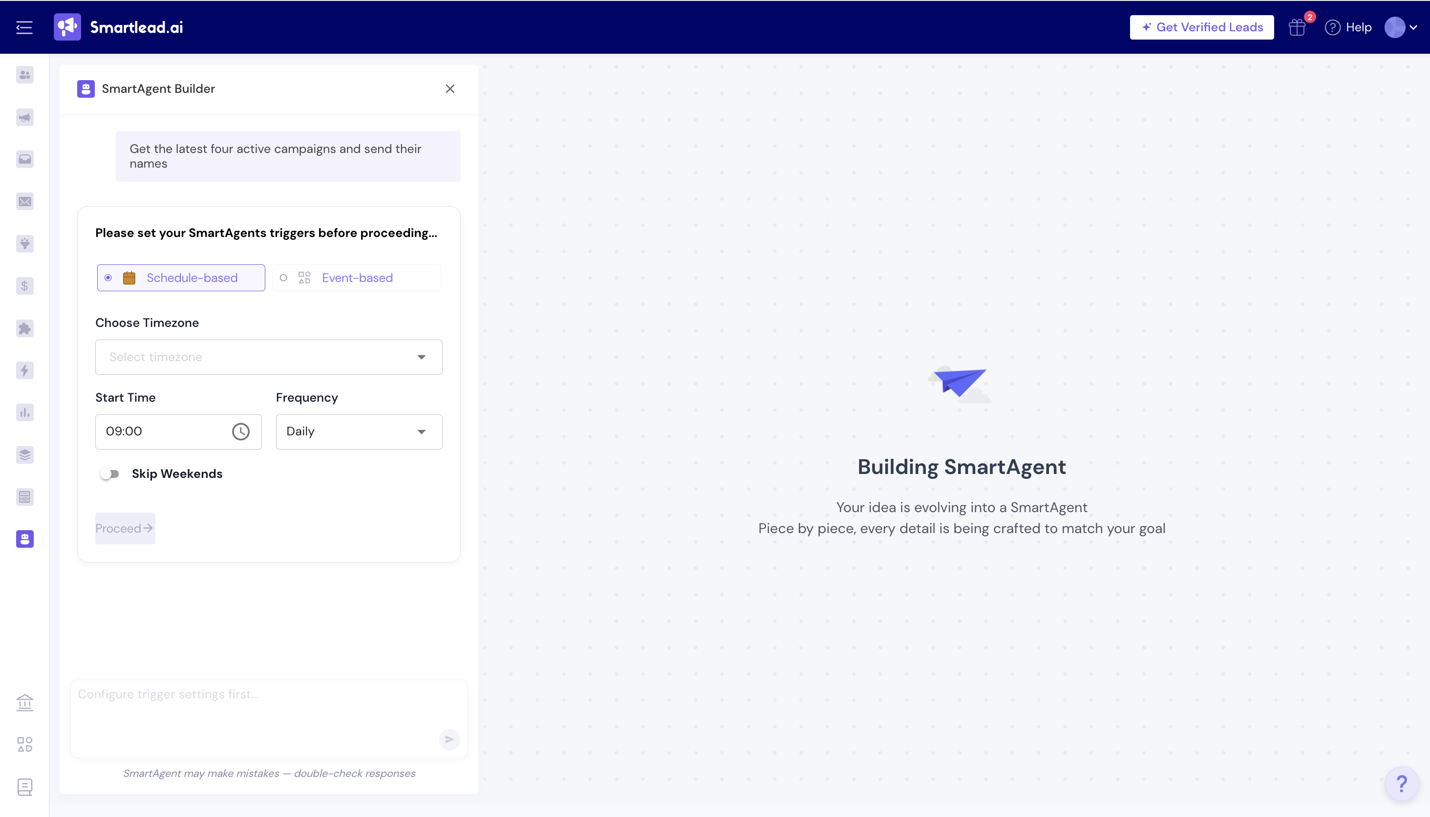Set triggers (schedule, timezone, whether you want to skip weekends, or event-based triggers) for the SmartAgents to perform the action.