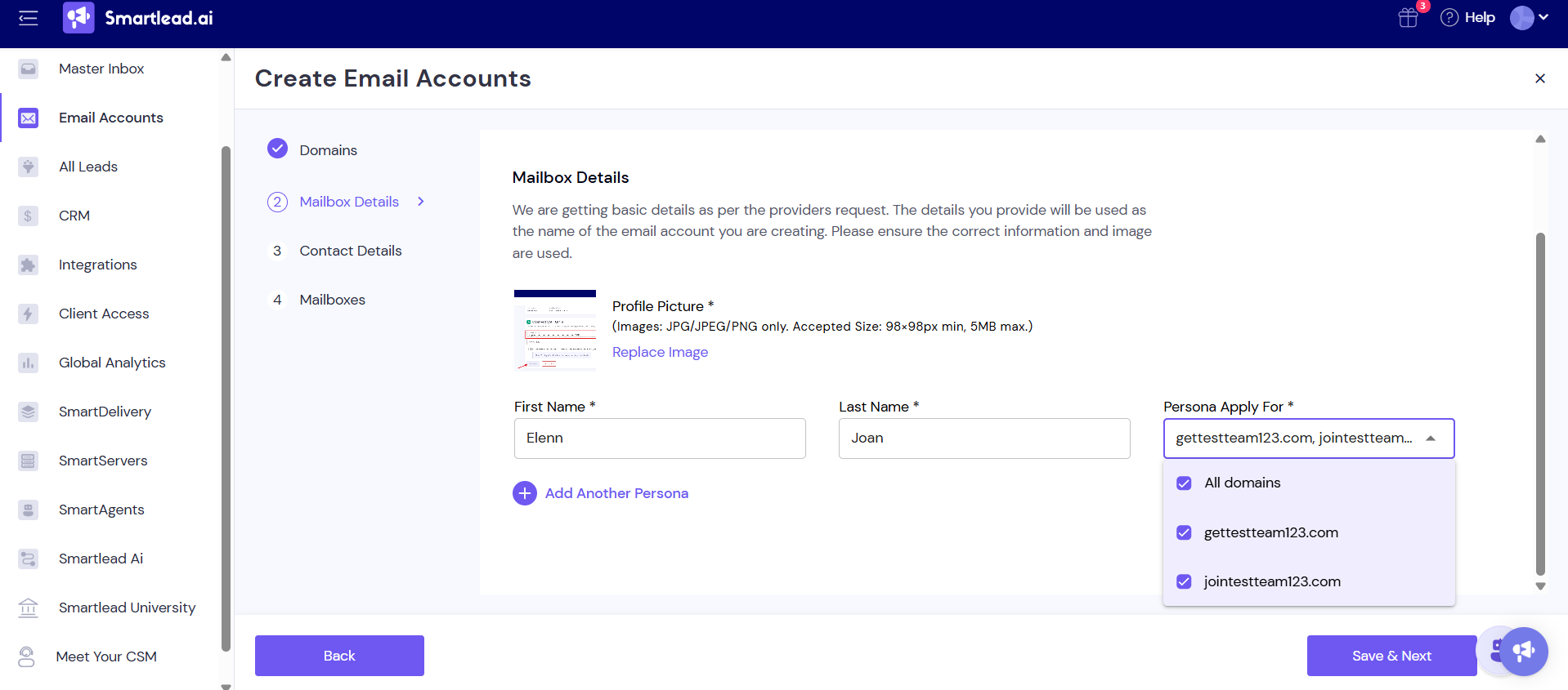 Set Up Mailboxes → Assign names, profile photos and persona apply for. Then click on save & next.