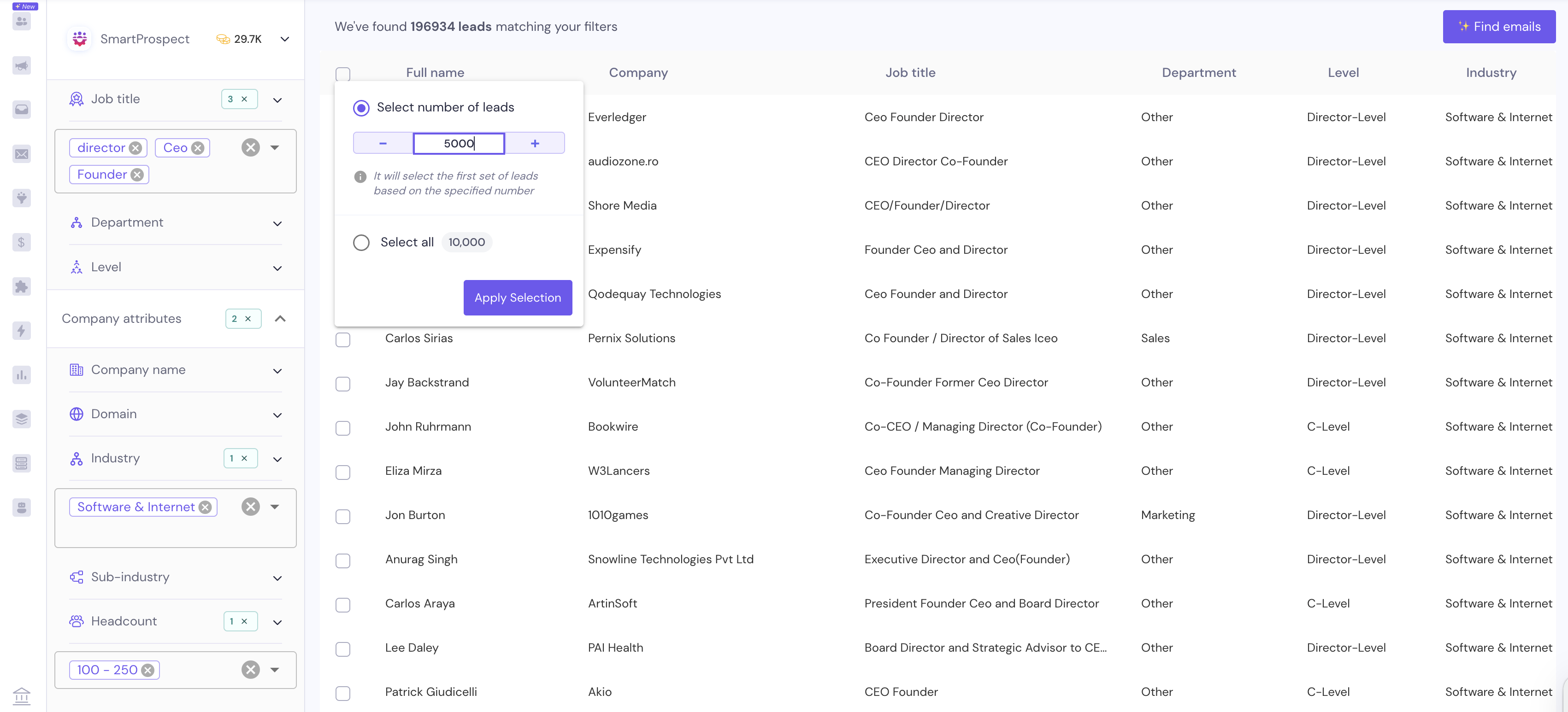 After loading, you’ll see your prospect list: names, titles, LinkedIn links, and company details. To get verified emails, enter the number of leads you want to find and click “Find emails”.