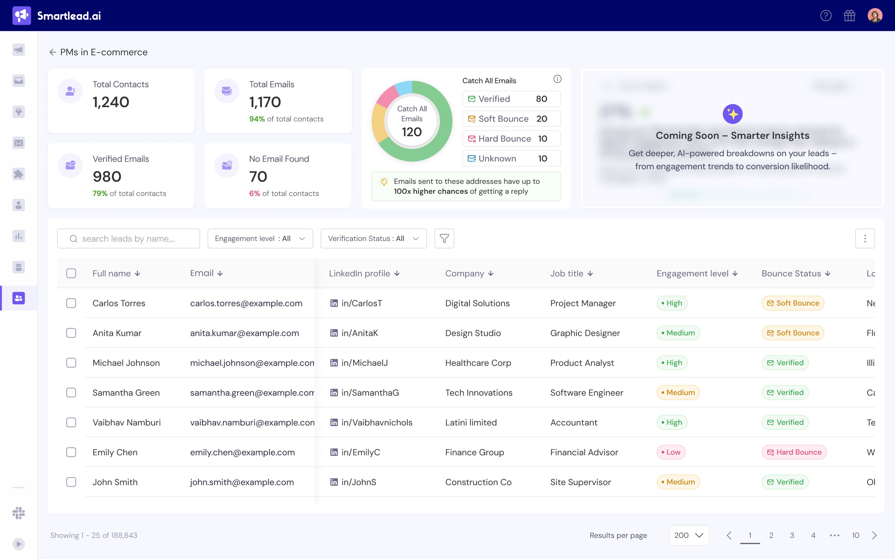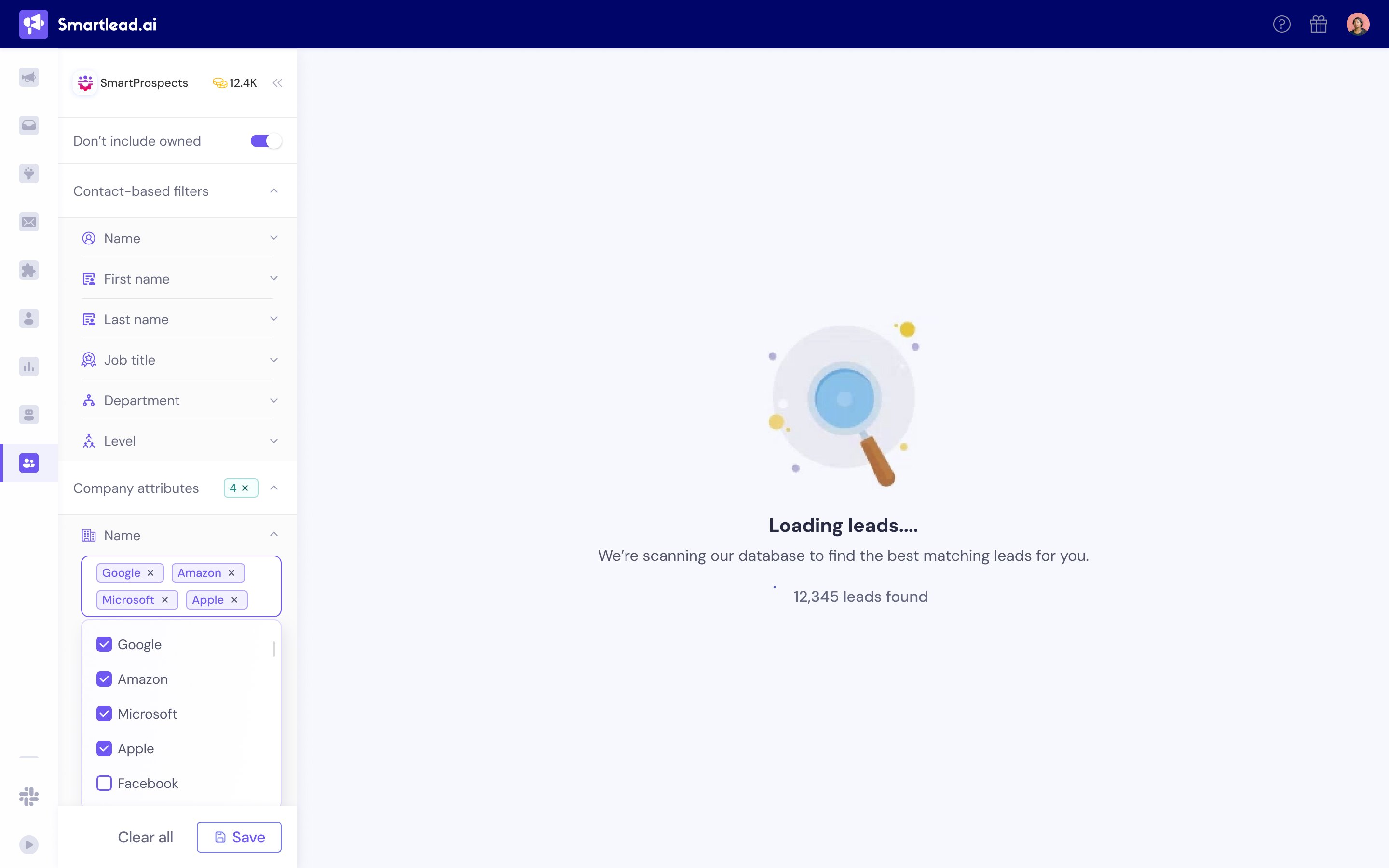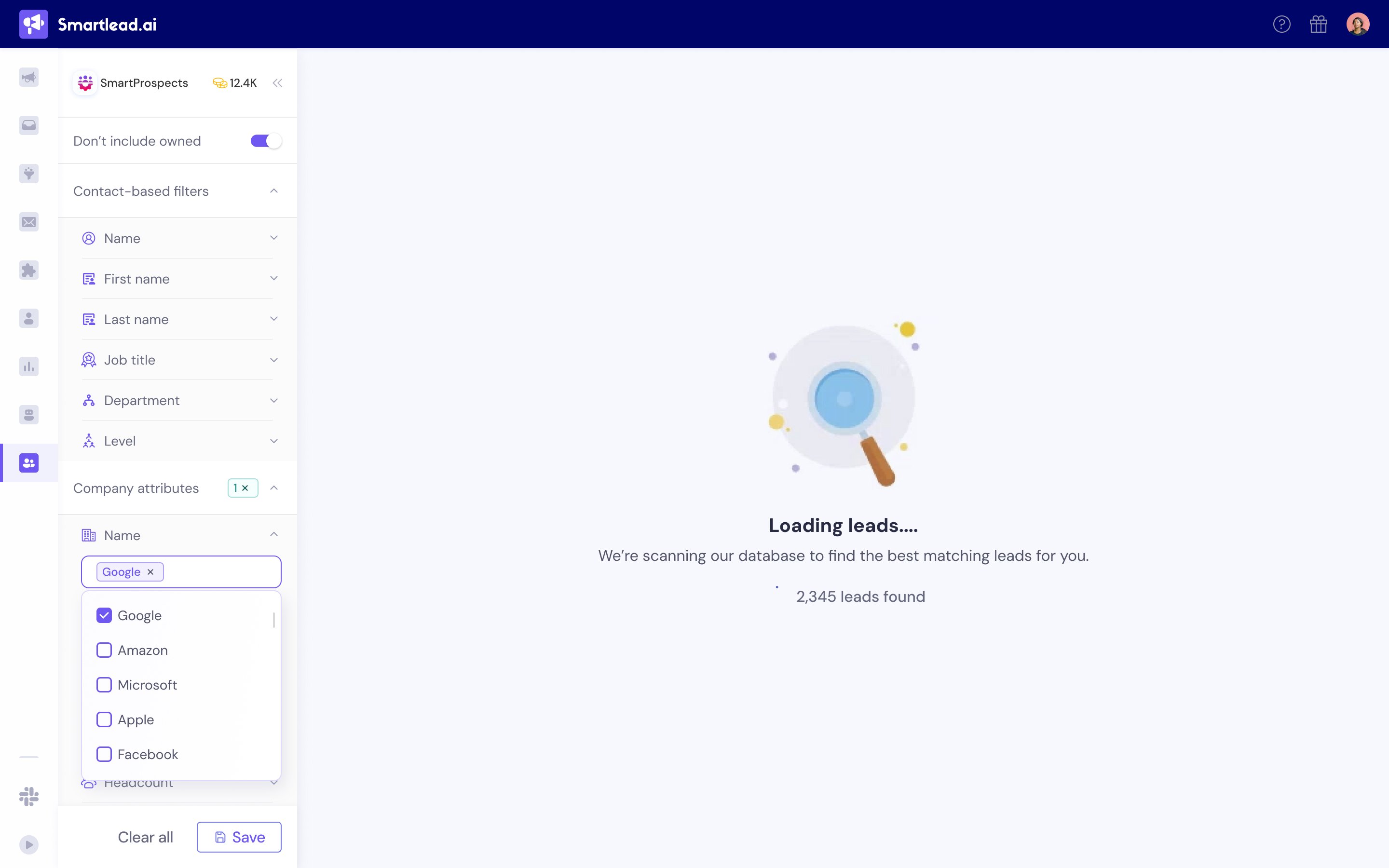 Once you set filters, SmartProspect’s AI scans millions of verified profiles to find your best matches. Each result is matched against Smartlead’s internal data pool to ensure freshness and accuracy.