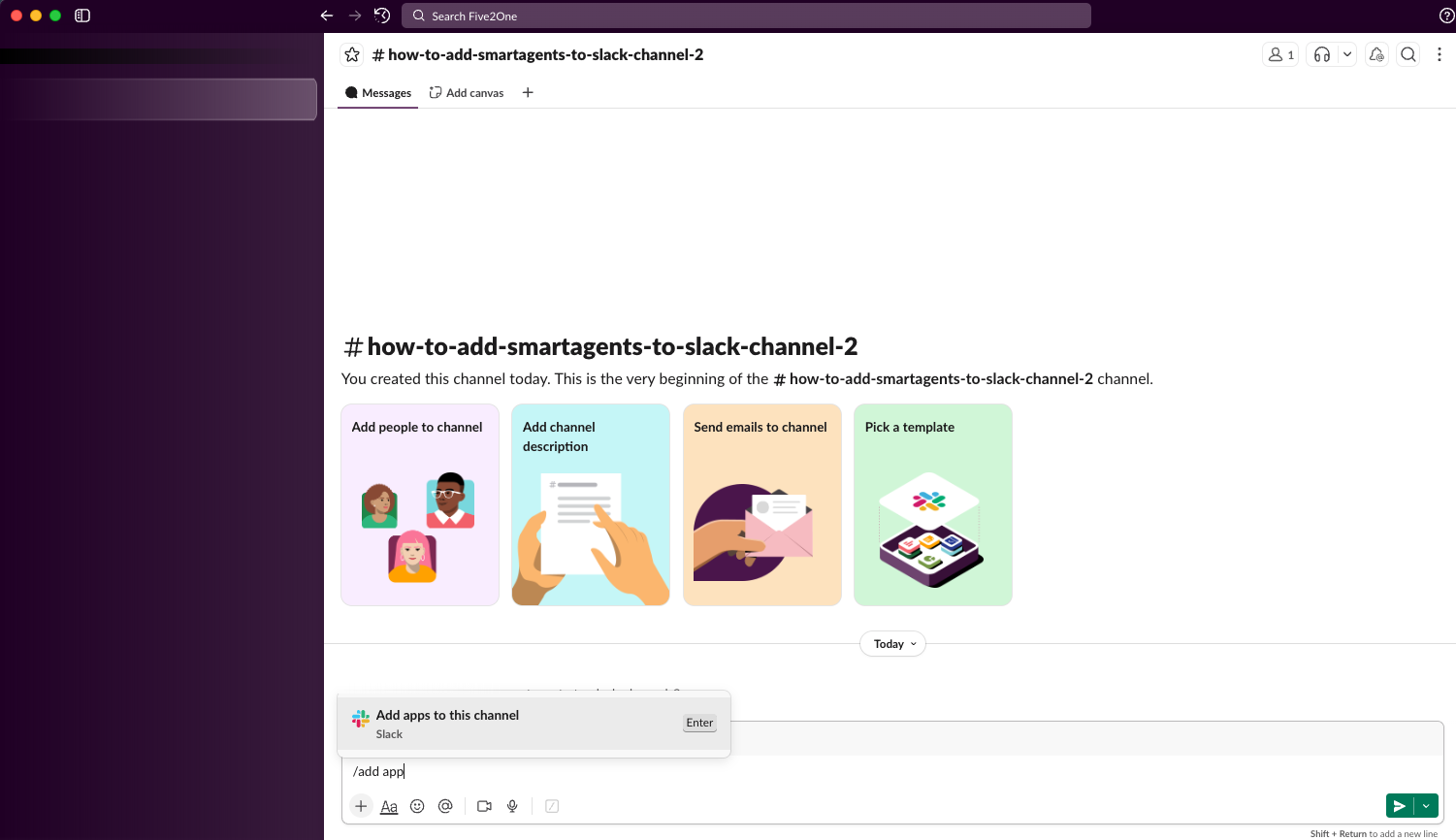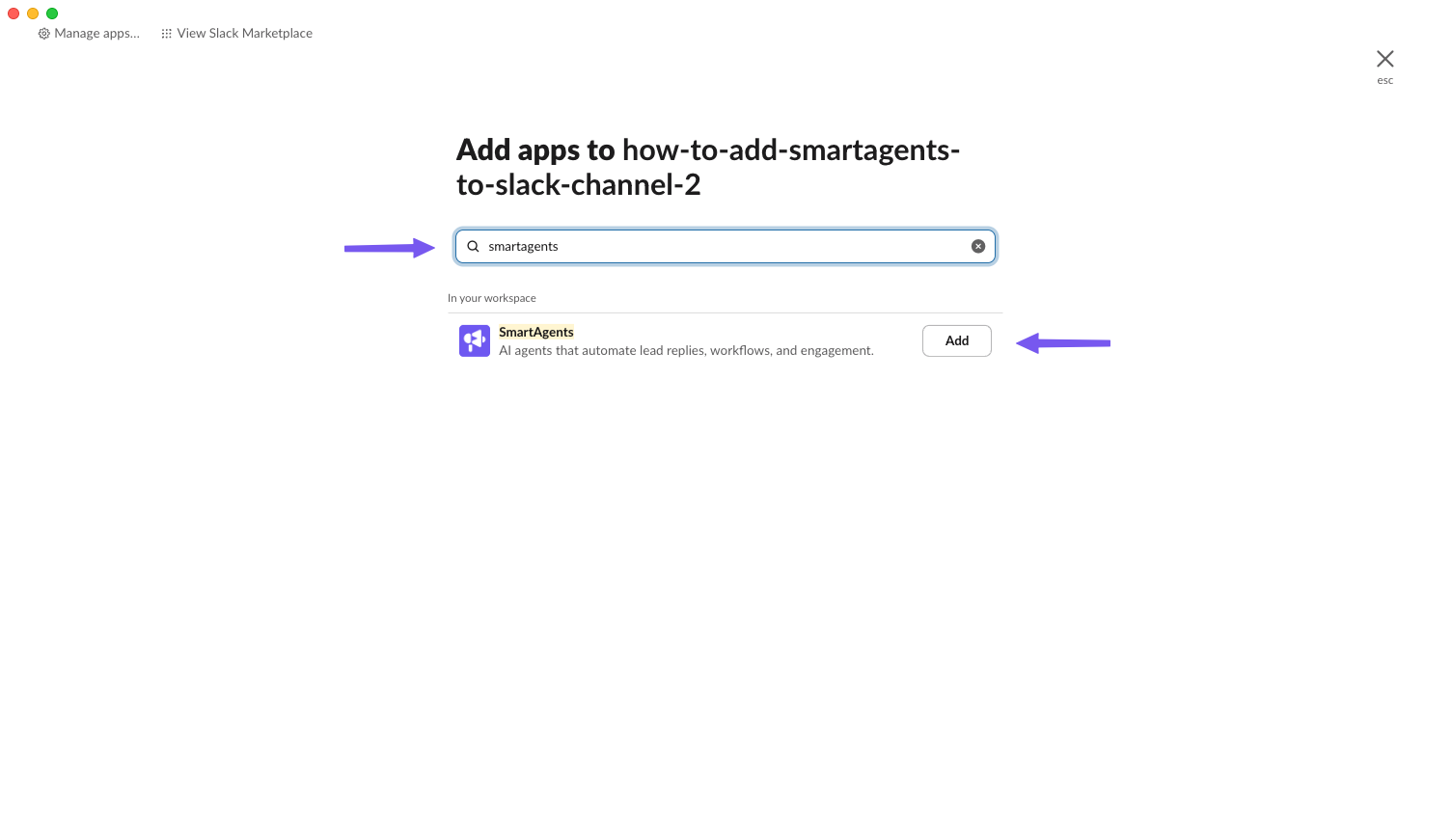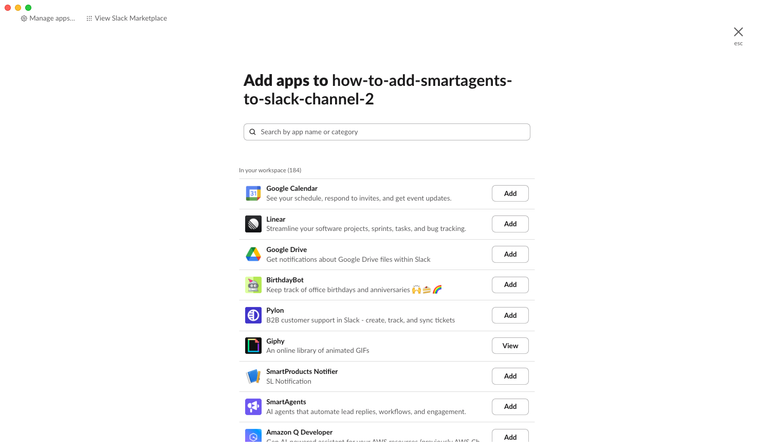 If you’re using Slack inside your SmartAgents workflows, you must add SmartAgents to the Slack channel where you want to receive messages, alerts, or reports.