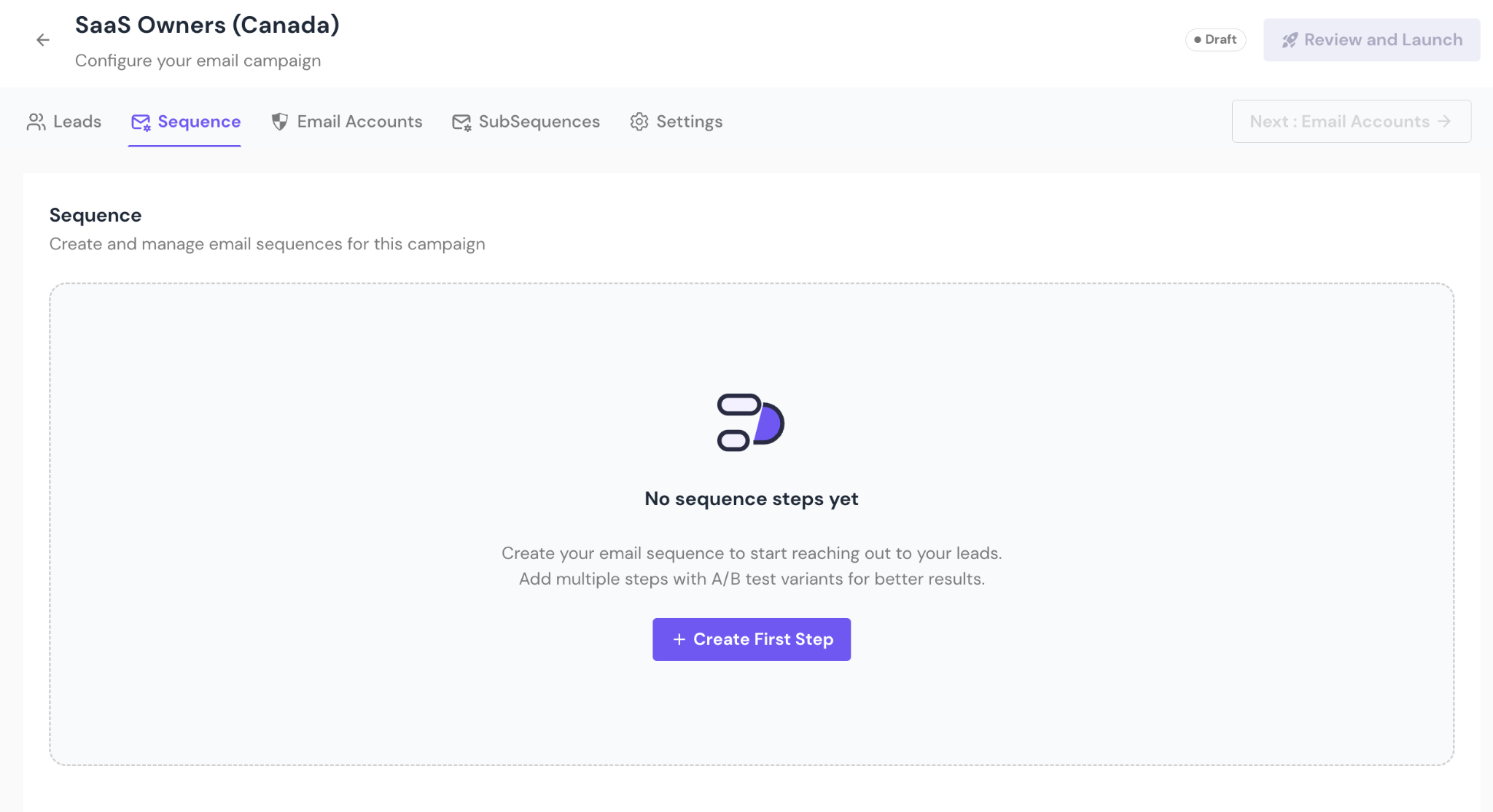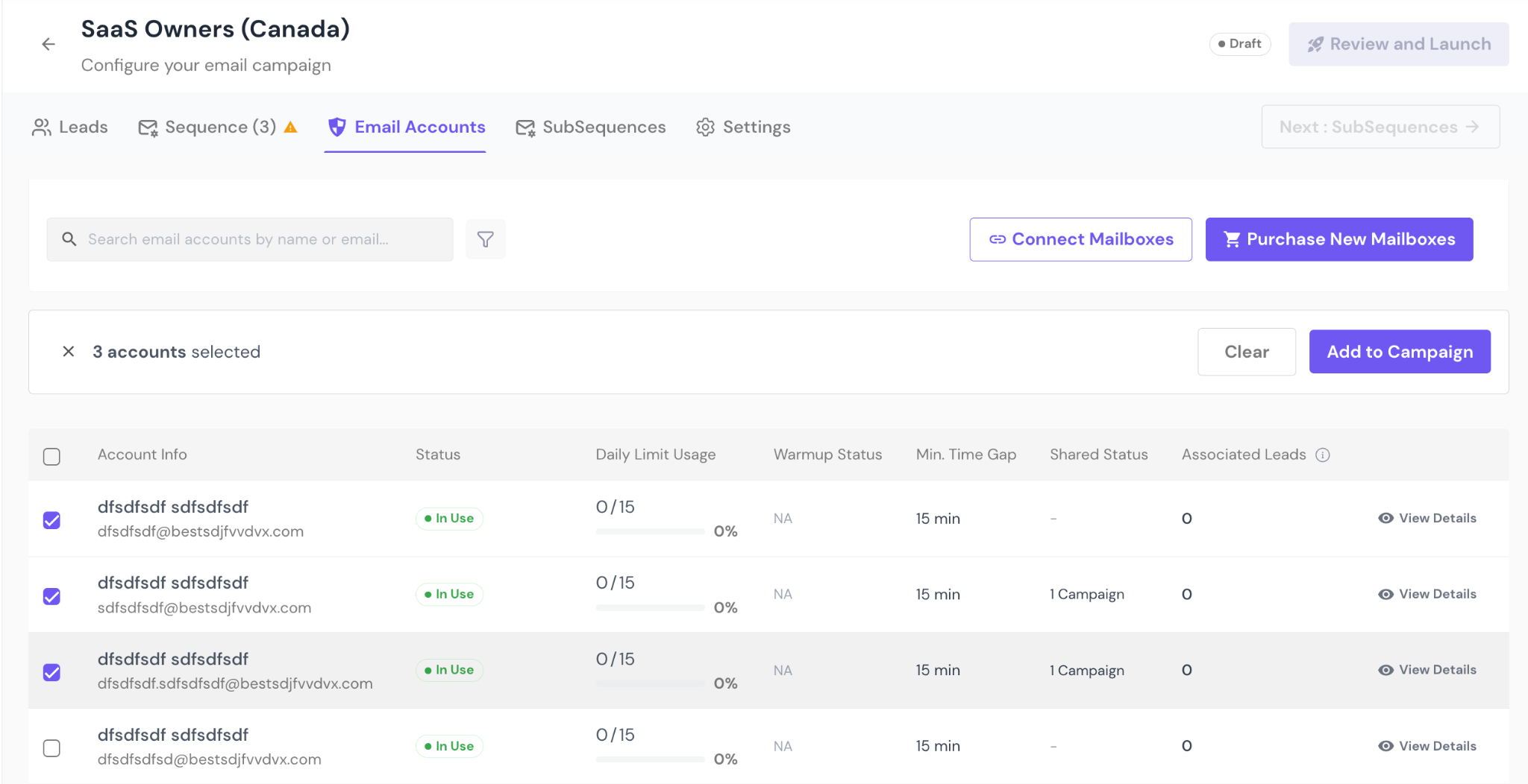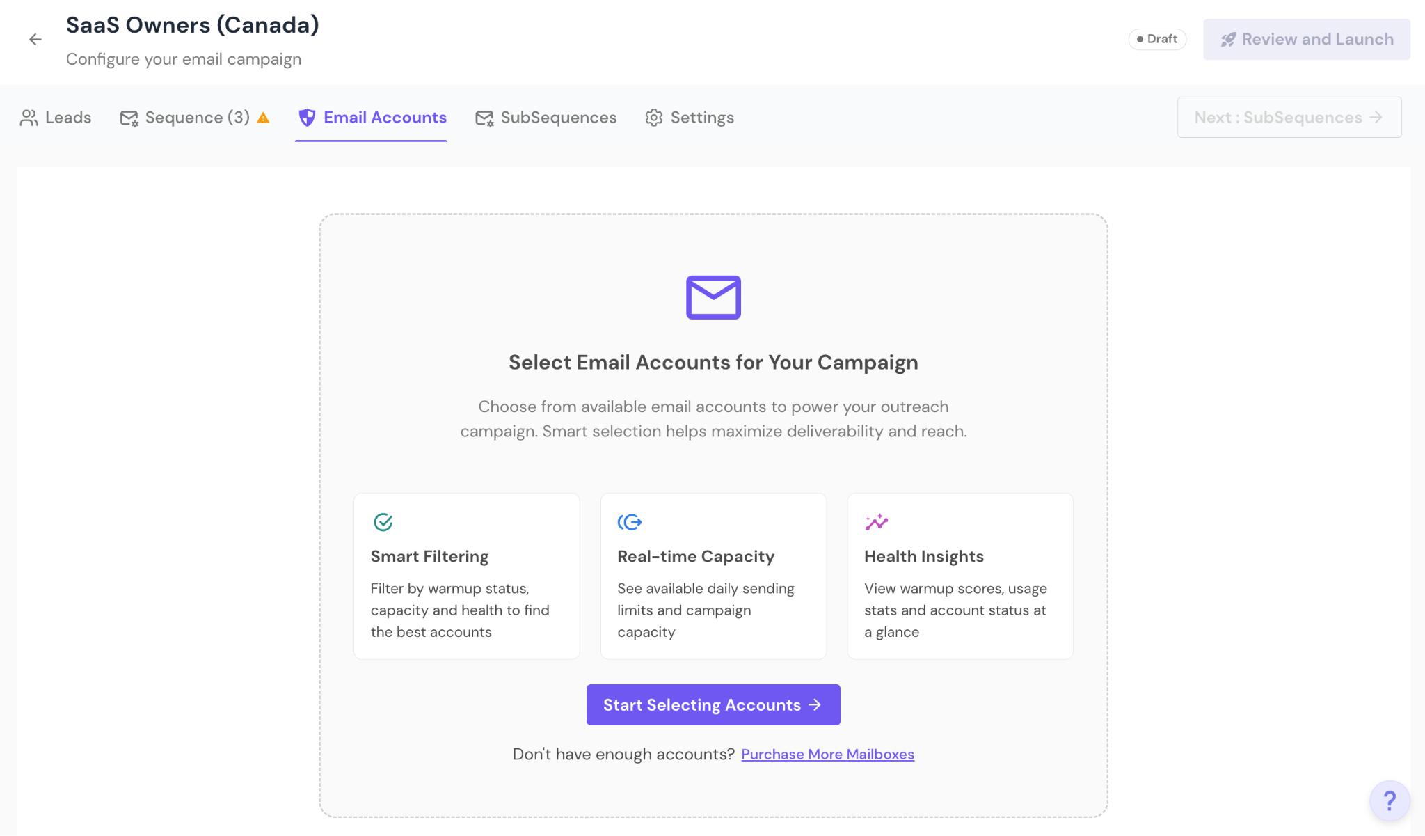 Once you have saved the sequence steps, click on “Next: Email Accounts”. This section lets you assign email accounts to your campaign.