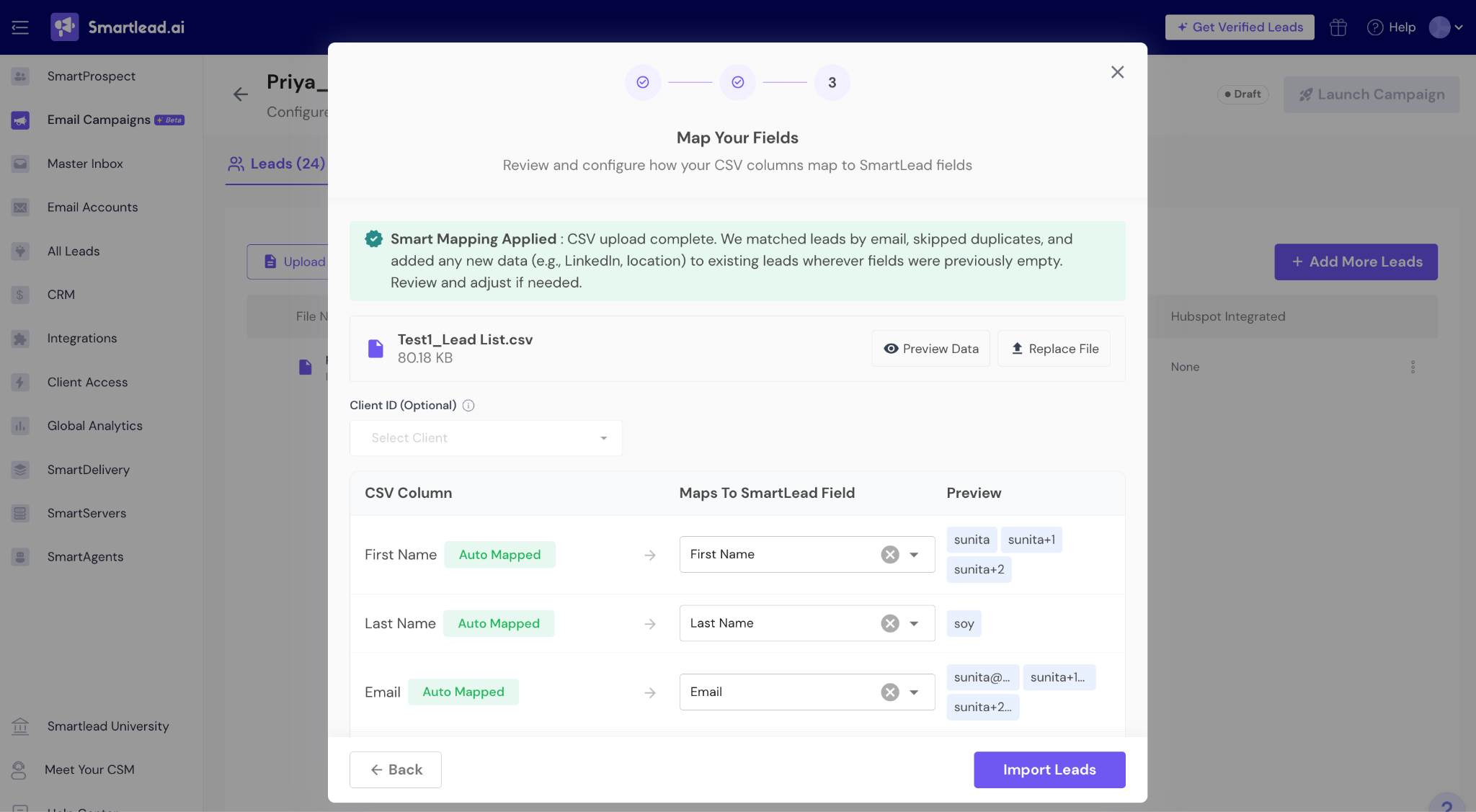 Smartlead automatically maps CSV columns to Smartlead fields using smart matching.