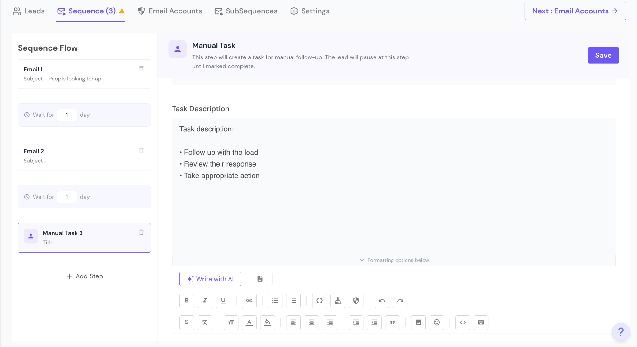 Note: An Email step sends an automated email to your leads, while a Manual Task pauses the sequence and creates a task for manual follow-up before the campaign continues.