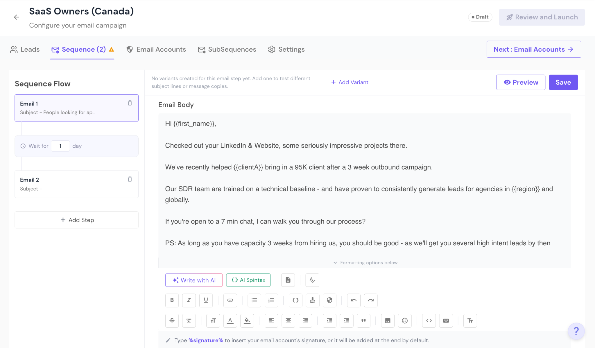 AI Spintax – define multiple wording variations within one email that are automatically rotated during sending.