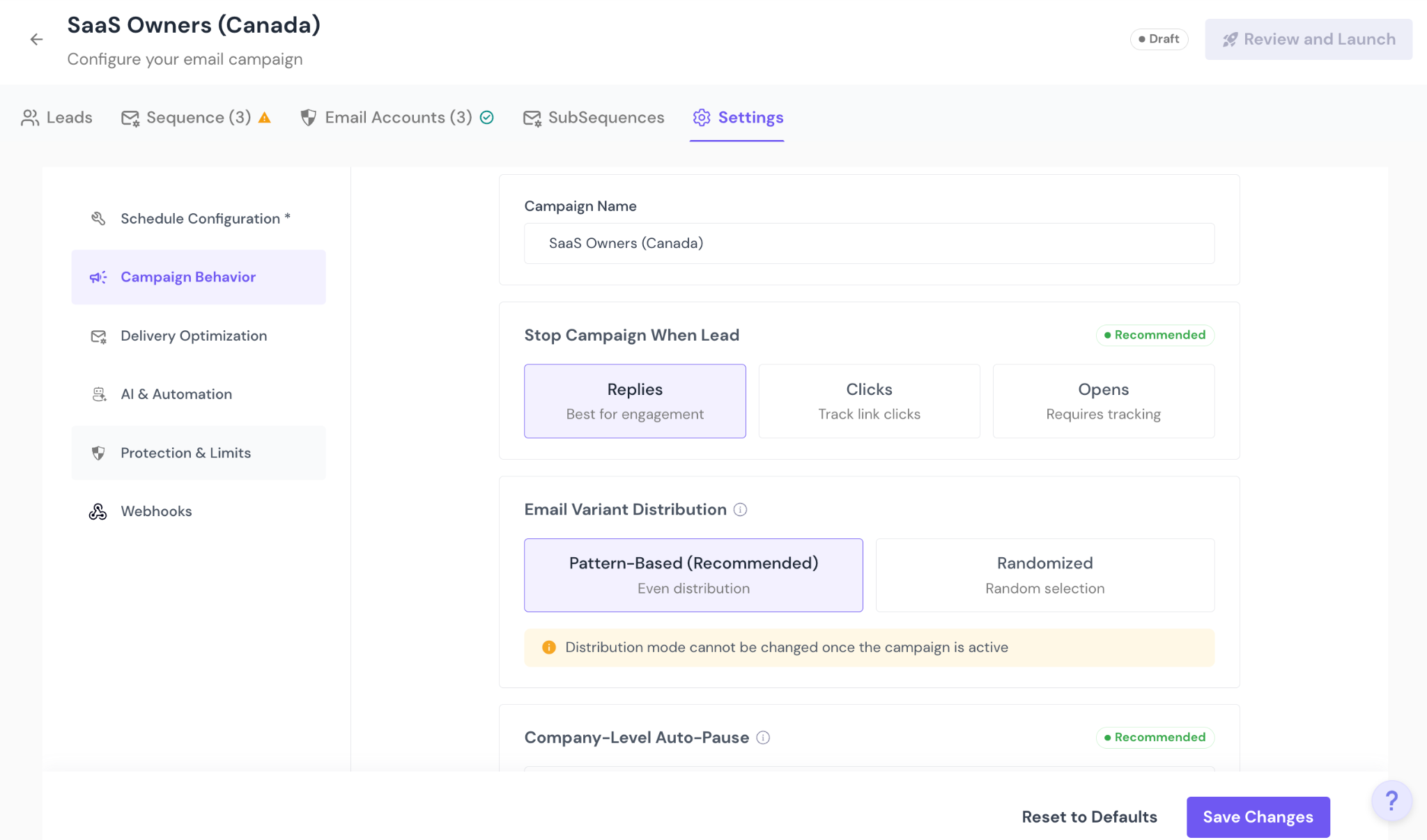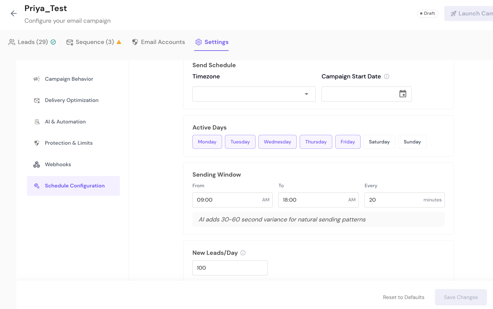 Smartlead automatically adds small timing variations to maintain natural sending patterns.