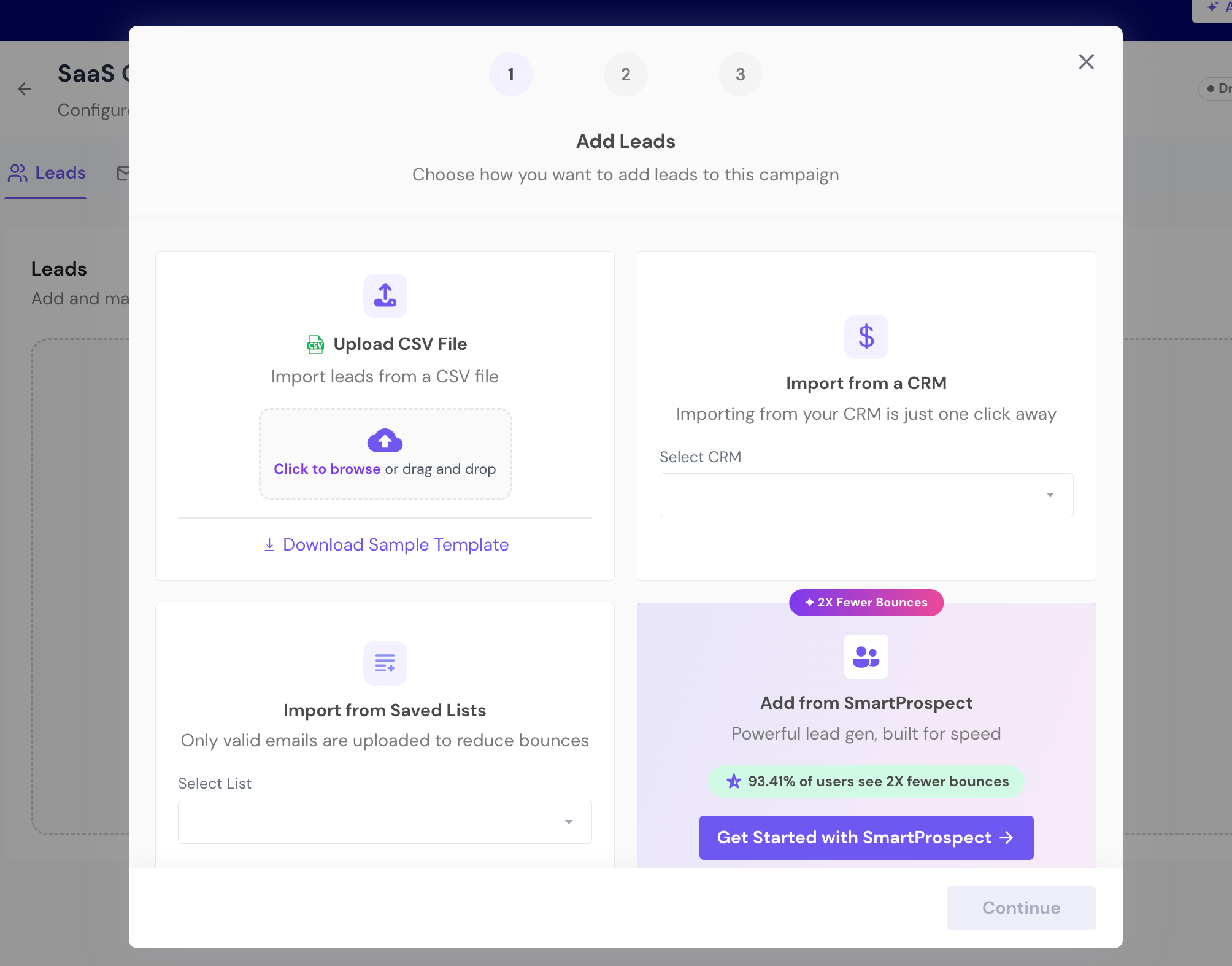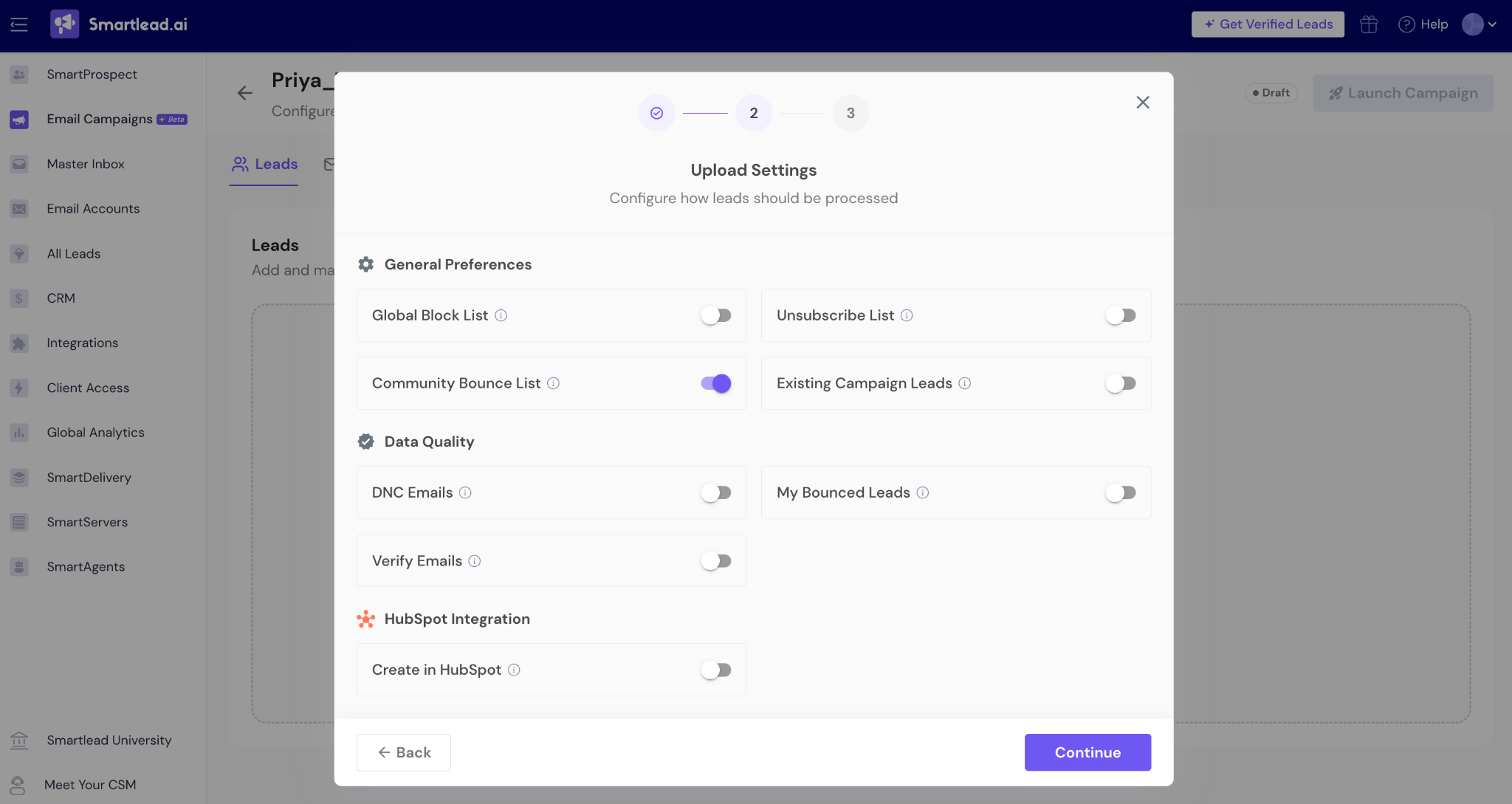 After you select how you want to add leads, you’ll be asked to configure how those leads should be processed before they’re added to your campaign. These settings help you avoid duplicates, reduce bounces, and stay compliant.
