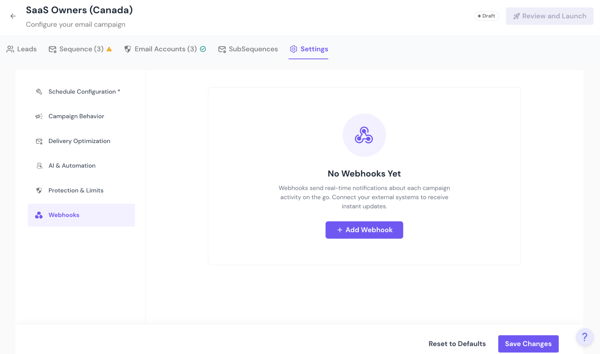 Set up webhooks to receive real-time campaign events and activity updates in external systems.