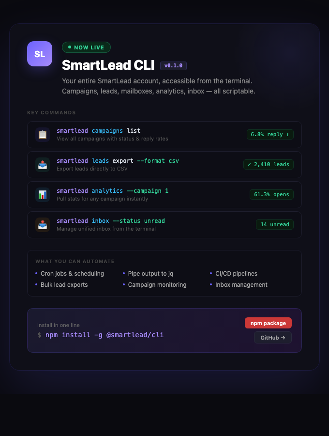 The Smartlead CLI (Command Line Interface) lets you manage your Smartlead account directly from the terminal. Instead of logging into the dashboard, you can run commands to handle campaigns, leads, mailboxes, analytics, and more - all from your command line or automated scripts.